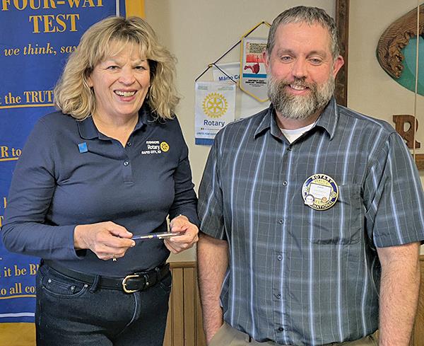 Custer Rotarian, Rob McWhorter presented $500 check to Kim for the Storehouse. |