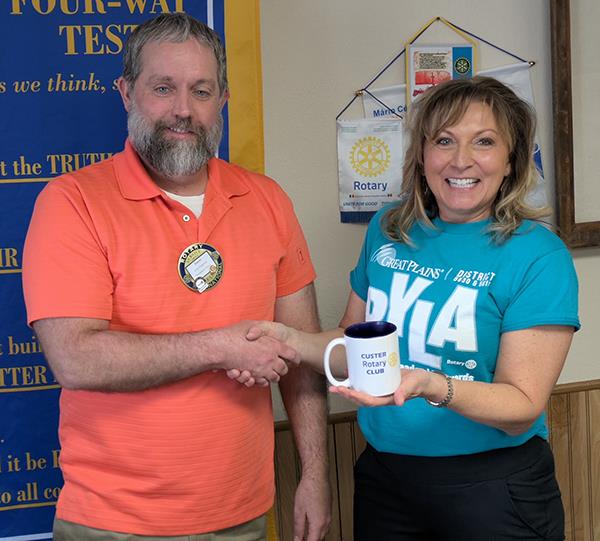Club learns about RYLA![]() Rene Sorenson, district chair for Rotary Youth Leadership Award, was the guest at the Feb. 9 meeting of the Custer Rotary Club, Sorenson told the club about the award, the upcoming camp and the club's opportunity to sponsor a camp attendee from the Custer area. She was presented a Custer Rotary Club mug after presenting.